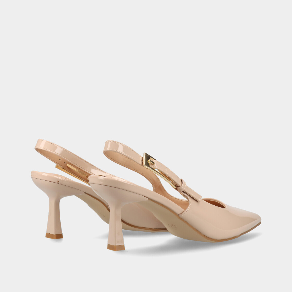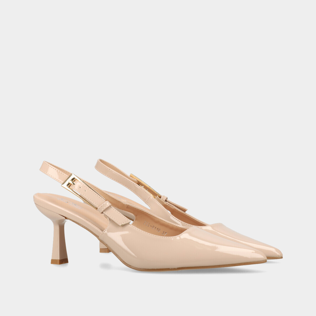 Sapato de festa nude com efeito verniz, ponta em bico e tira traseira com fivela ajustável. Modelo elegante com tacão fino, ideal para festas, cerimónias, eventos formais e ocasiões especiais. Sapato feminino sofisticado que combina conforto, estilo e um acabamento luminoso perfeito.