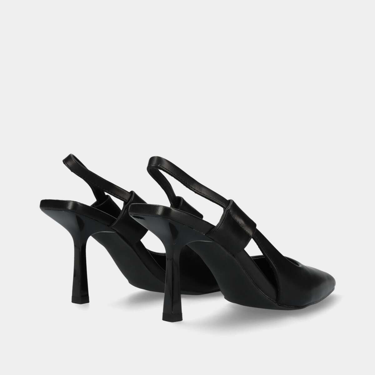 Sapato na cor preta, estilo stiletto aberto na parte de trás, biqueira em bico e ajuste com elástico oculto.