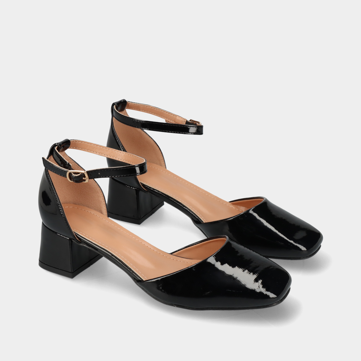 Sapatos de salto para mulher com efeito verniz, biqueira quadrada, tira com fivela lateral e tacão largo de 4,5 cm.