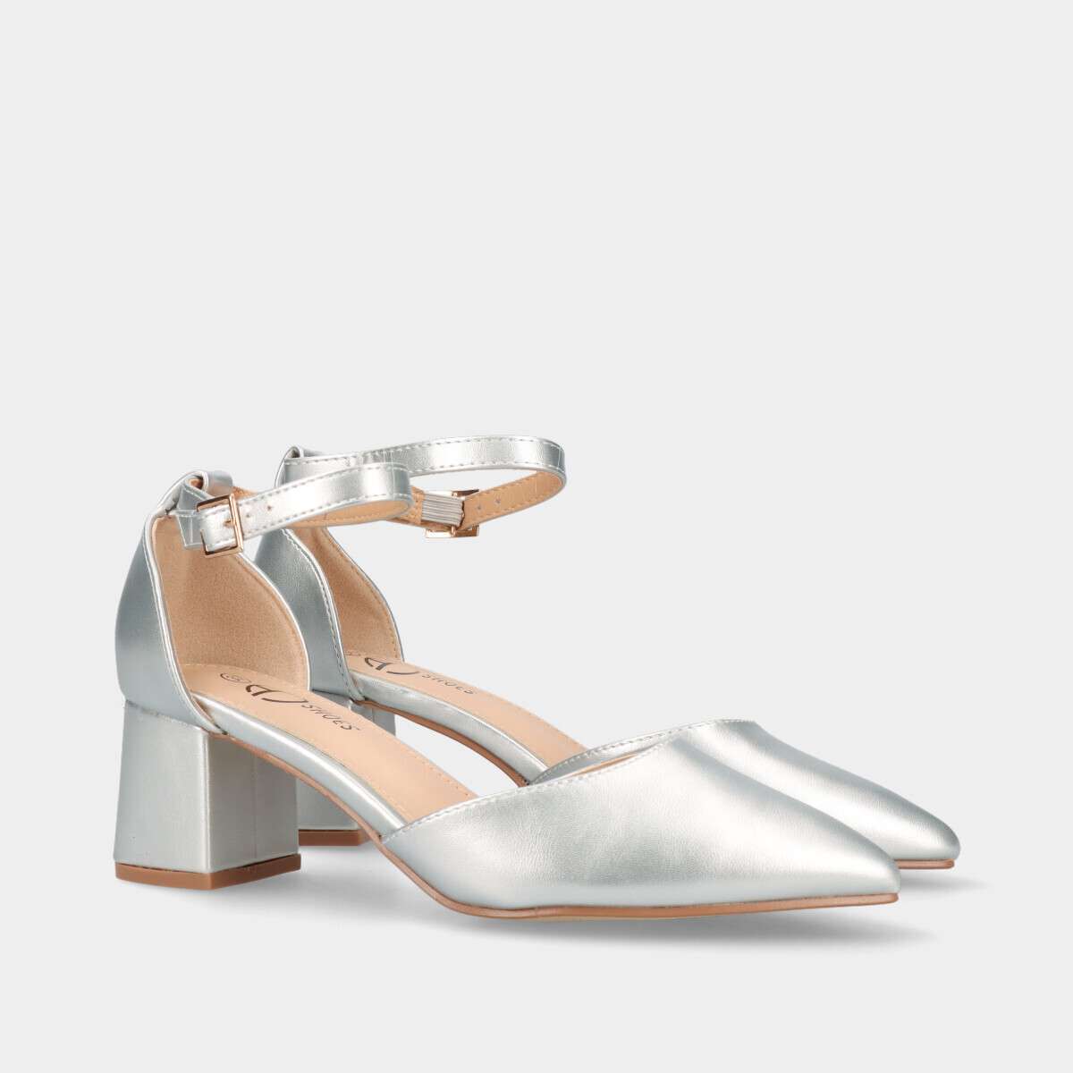 Sapato na cor prata, com fivela ajustável e salto médio.