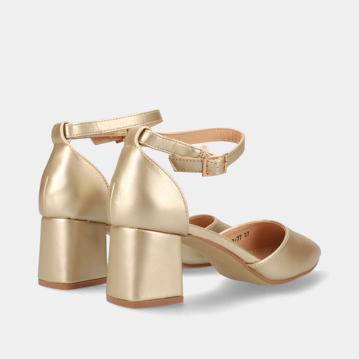 Sapato na cor dourada, com fivela ajustável e salto médio.