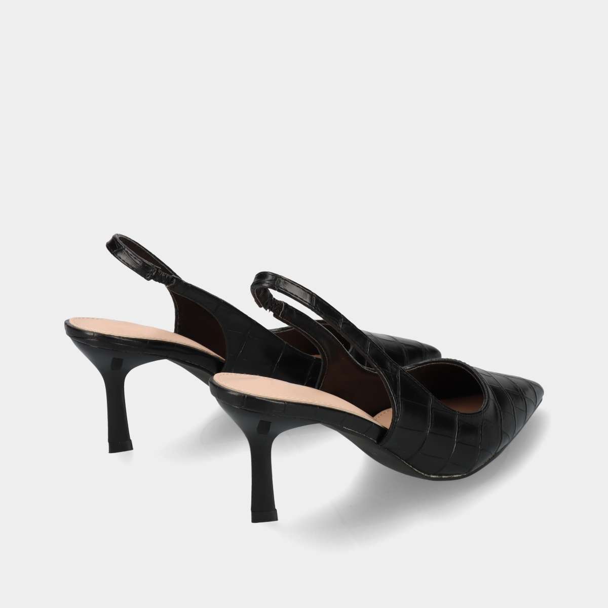 Sapato estilo mules com efeito croco, tira traseira, elástico discreto, tacão de 7 cm e ponta em bico.