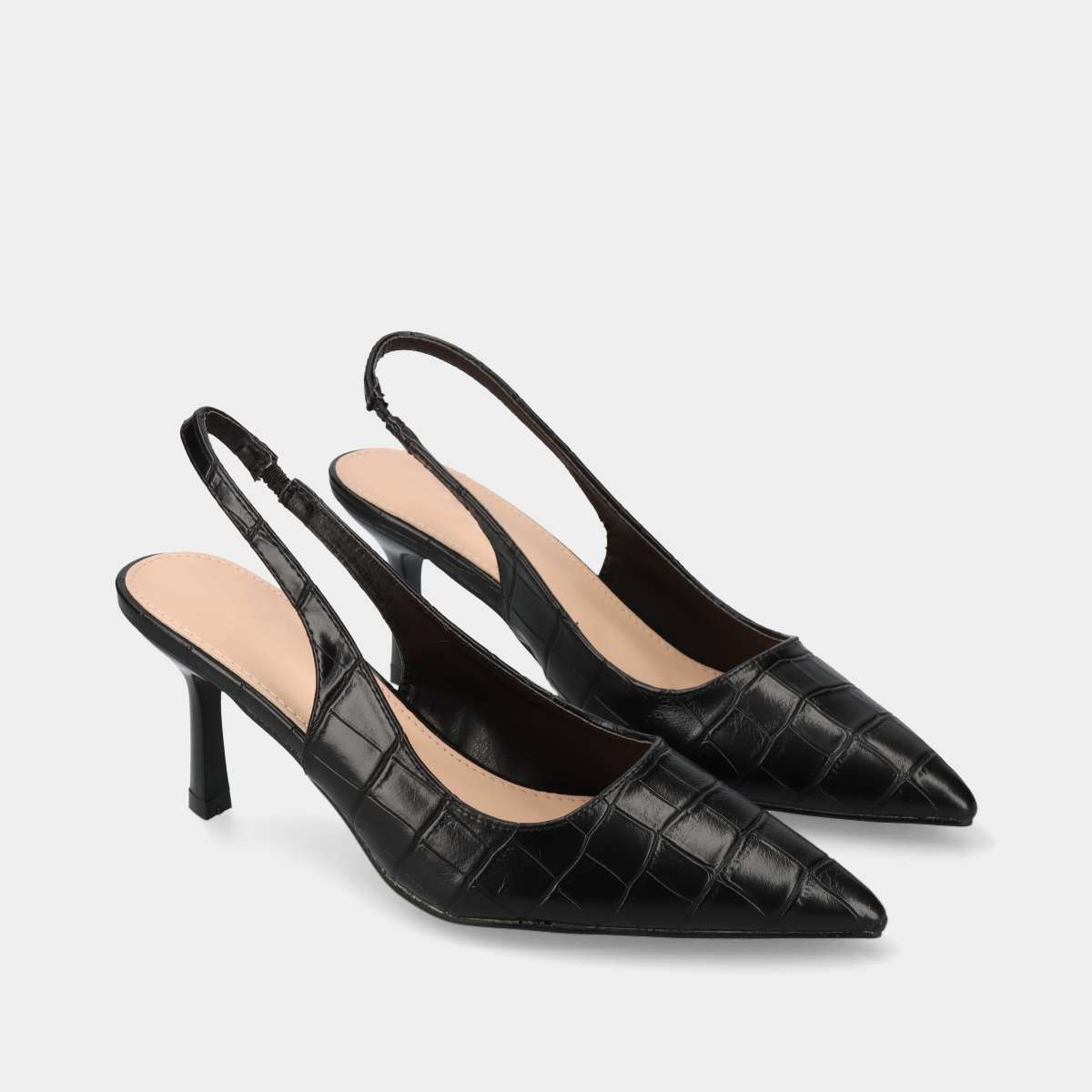 Sapato na cor preta, estilo stiletto aberto na parte de trás, biqueira em bico e ajuste com elástico discreto.