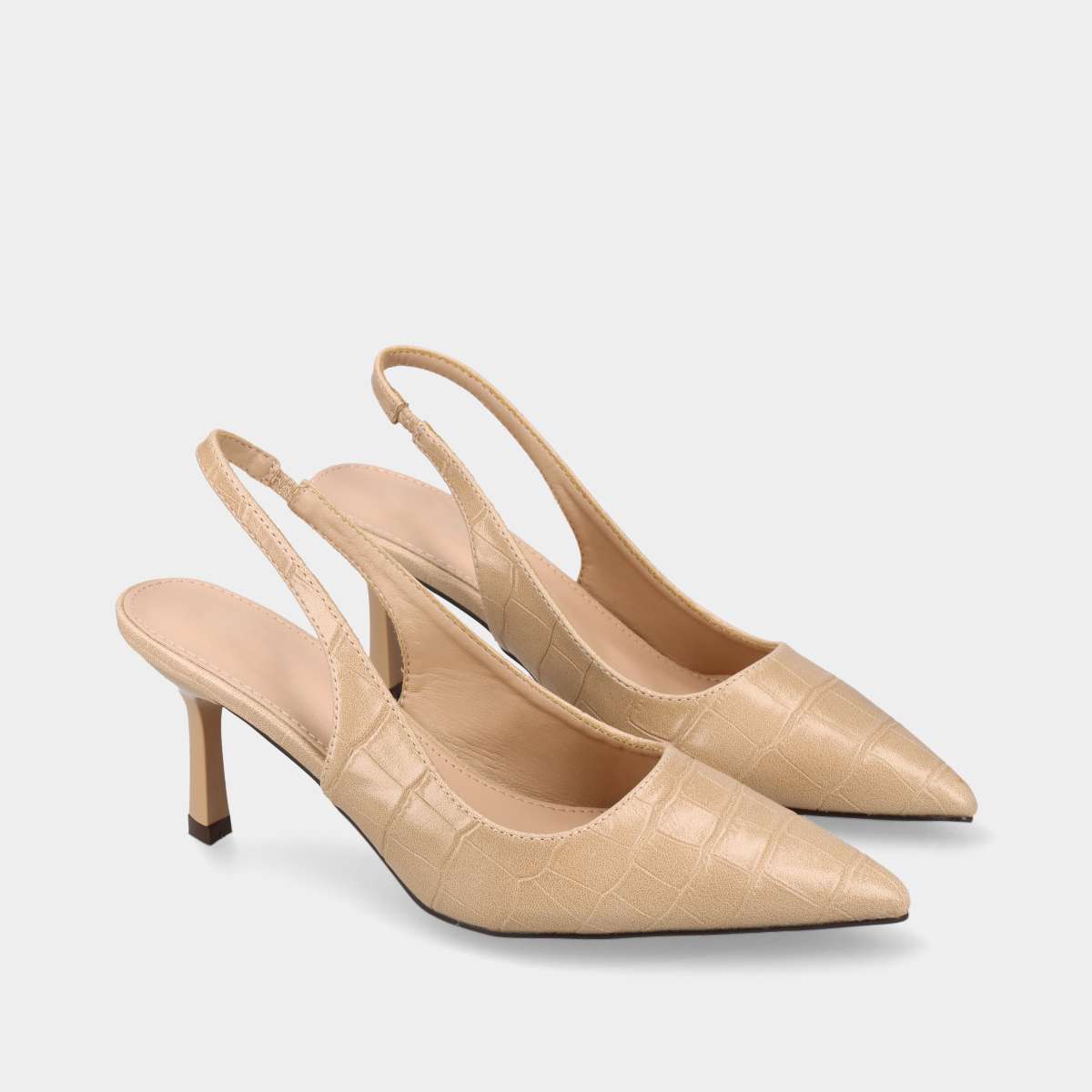 Sapato na cor bege, estilo stiletto aberto na parte de trás, biqueira em bico e ajuste com elástico discreto.