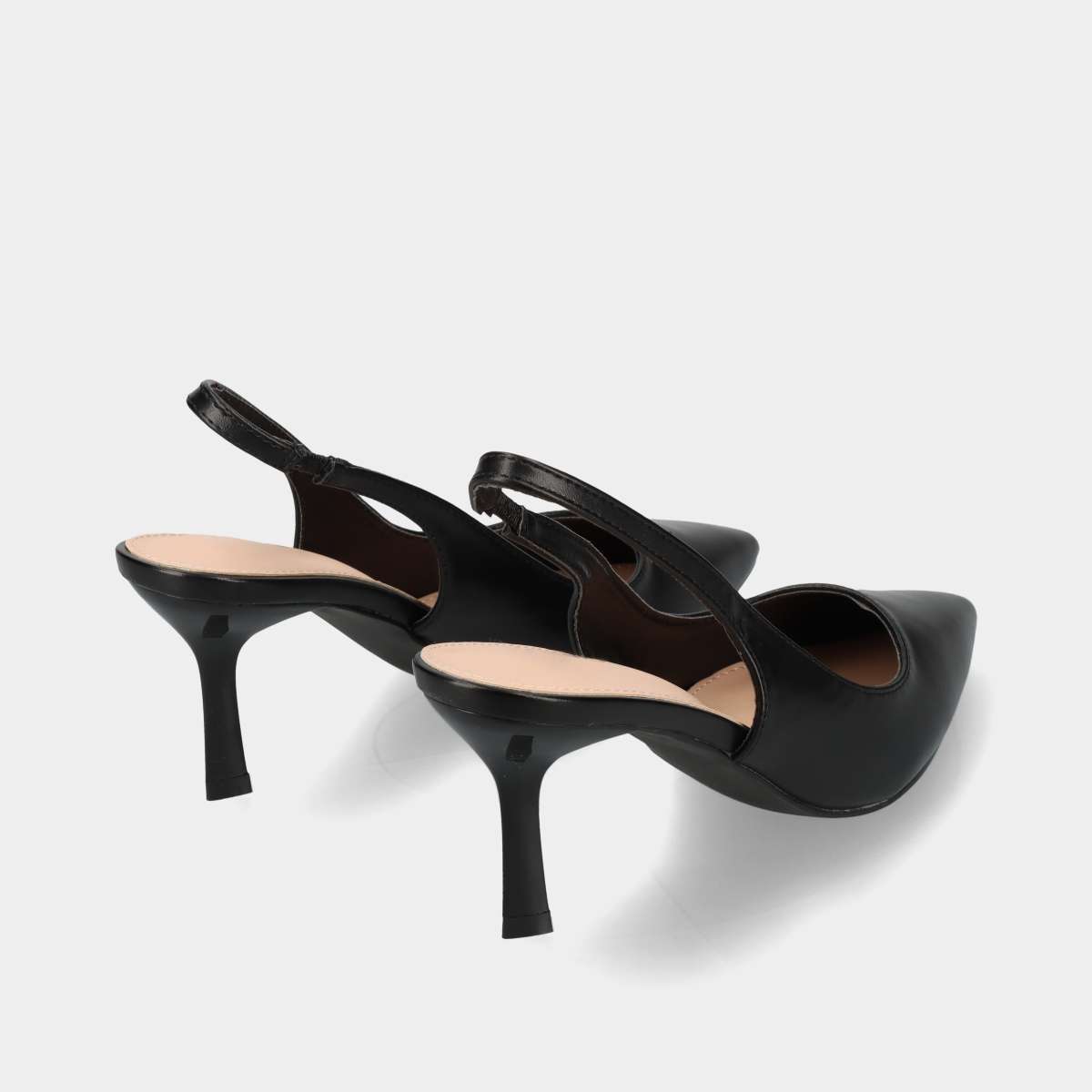 Sapato na cor preta, estilo stiletto aberto na parte de trás, biqueira em bico e ajuste com elástico discreto.