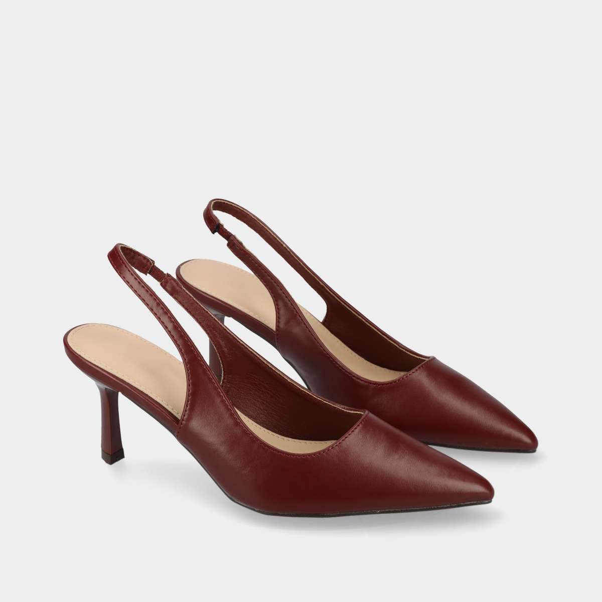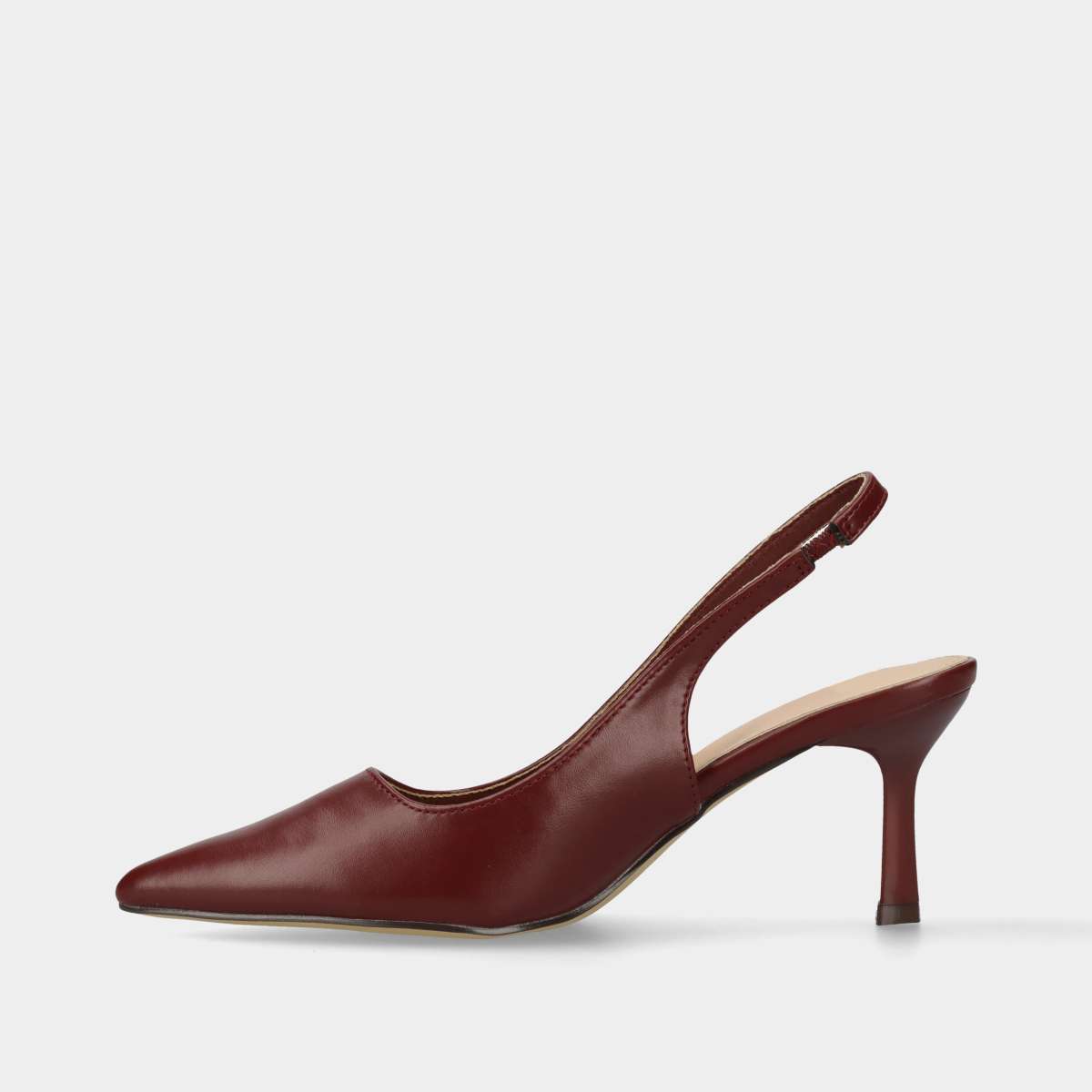 Sapato na cor bordô, estilo stiletto aberto na parte de trás, biqueira em bico e ajuste com elástico discreto.