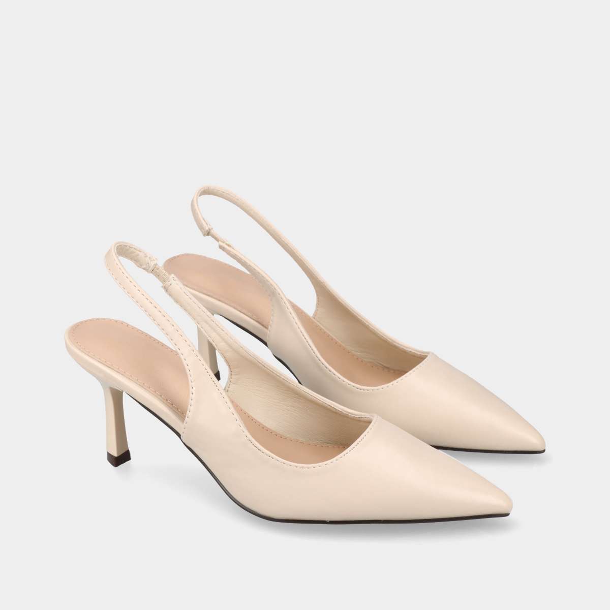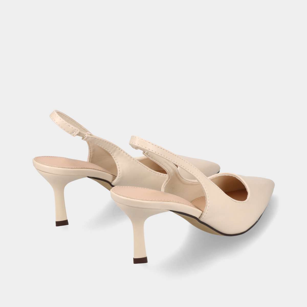 Sapato na cor creme, estilo stiletto aberto na parte de trás, biqueira em bico e ajuste com elástico discreto.
