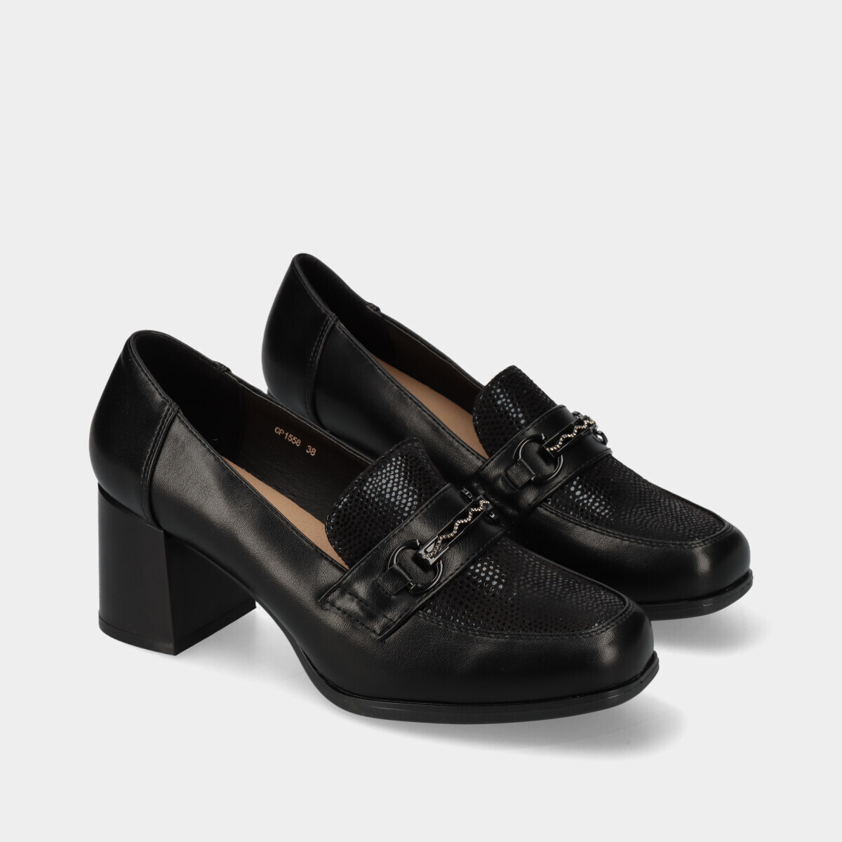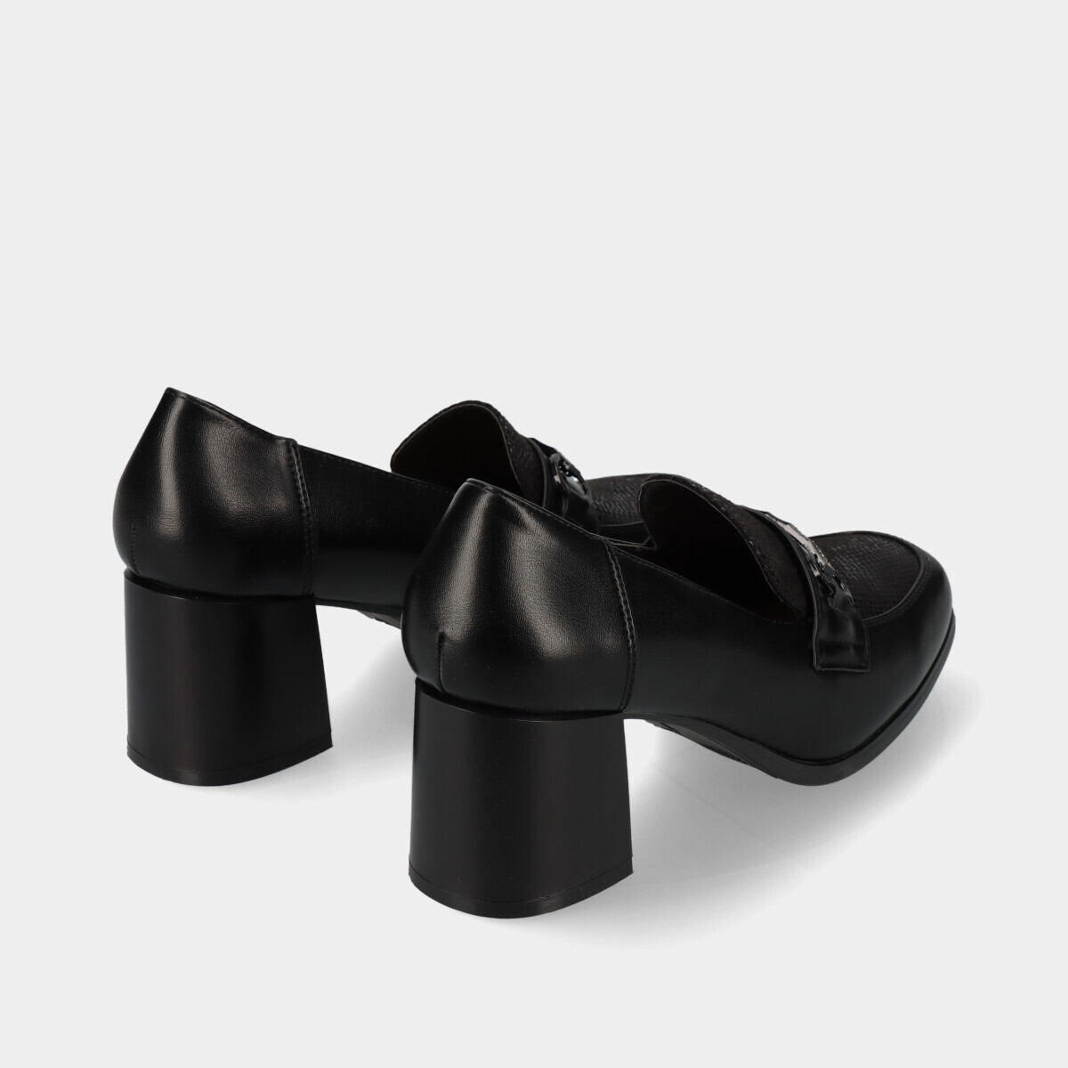 Sapatos clássicos para mulher em preto, com salto grosso médio, frente ligeiramente quadrada e efeito pele texturizado. Palmilha confortável e aplicação decorativa elegante, ideais para o dia a dia ou escritório.