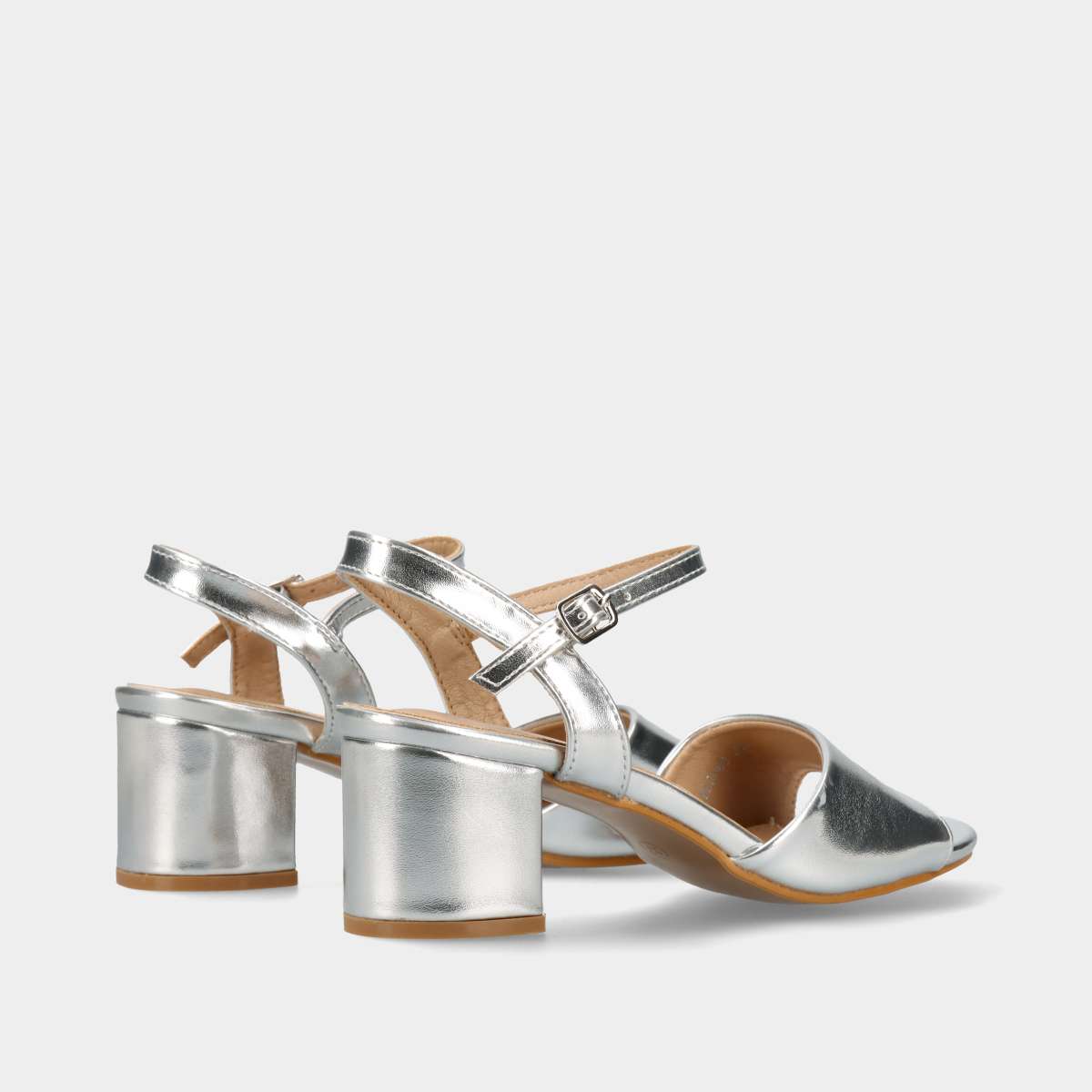 Sandália de festa com salto estável e confortável na cor prateada, com fivela lateral para fácil ajuste.