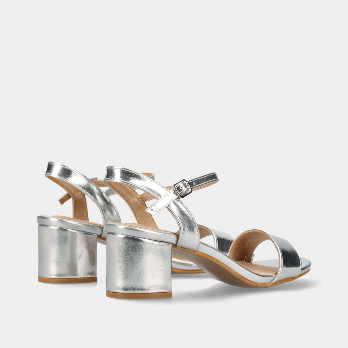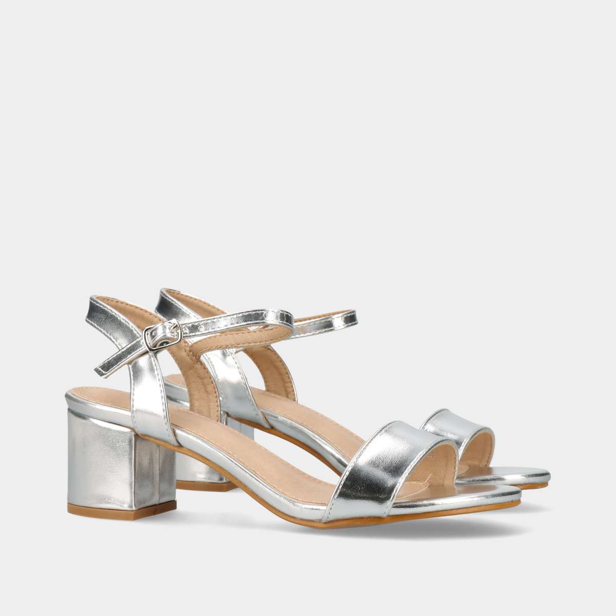 Sandália de festa com salto estável e confortável na cor prateada, com fivela lateral para fácil ajuste.
