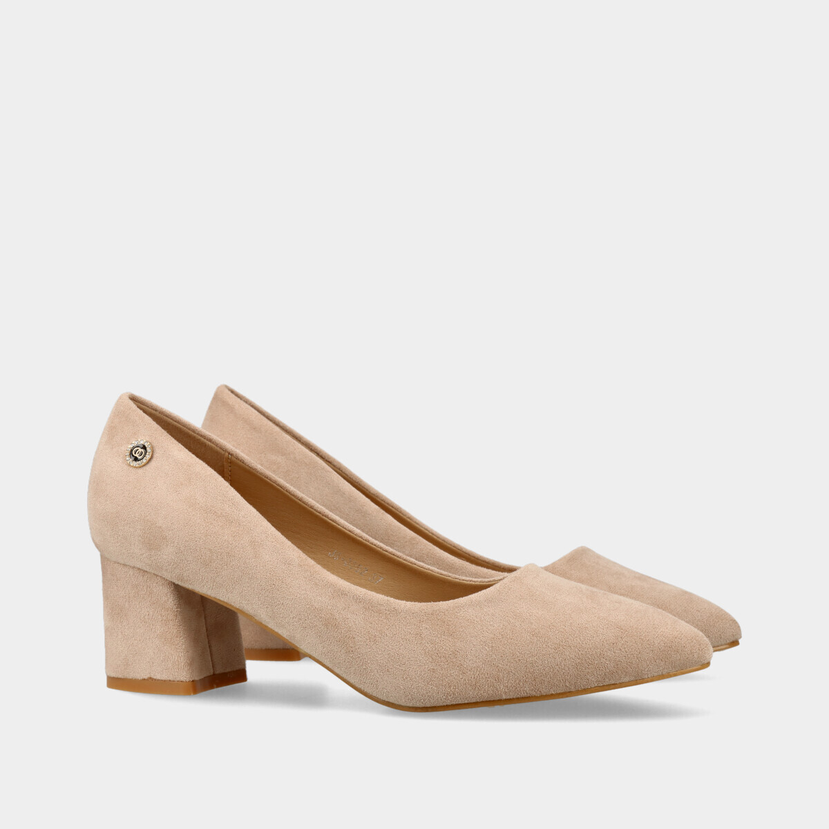 Sapatos de salto para mulher em bege com efeito camurça, ponta em bico, palmilha acolchoada e tacão quadrado que proporciona estabilidade e conforto. Sapatos femininos elegantes, versáteis e ideais para trabalho, cerimónias ou uso diário.