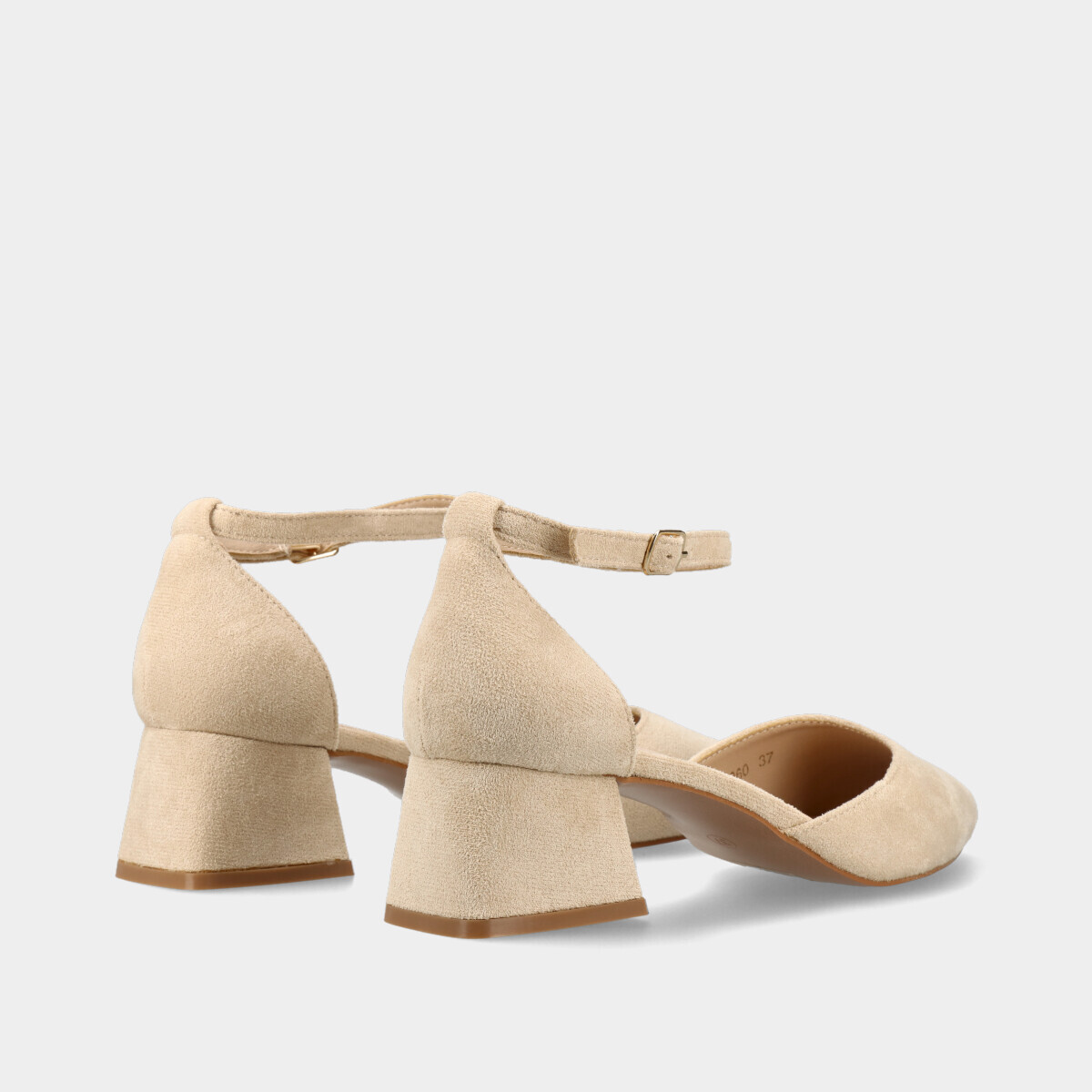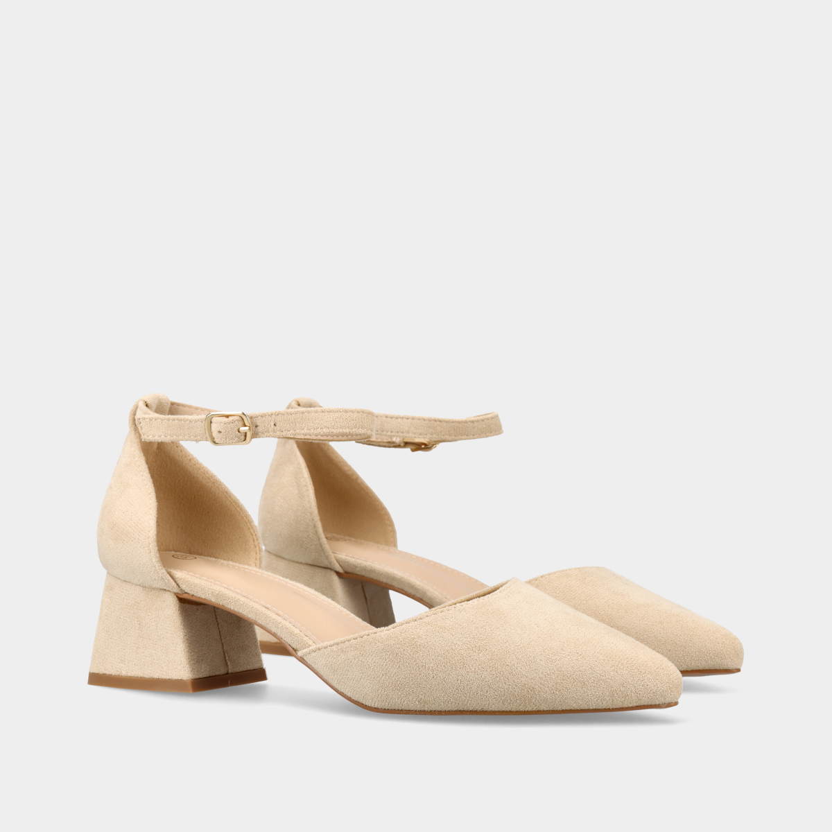 Sapato bege de salto quadrado, com efeito camurça e fivela lateral. Elegante e confortável, ideal para várias ocasiões.