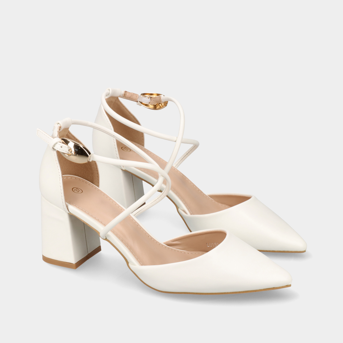 Sapato branco de salto quadrado, com tira cruzada no peito do pé e fivela dourada ajustável. Elegante e confortável, ideal para diversas ocasiões.