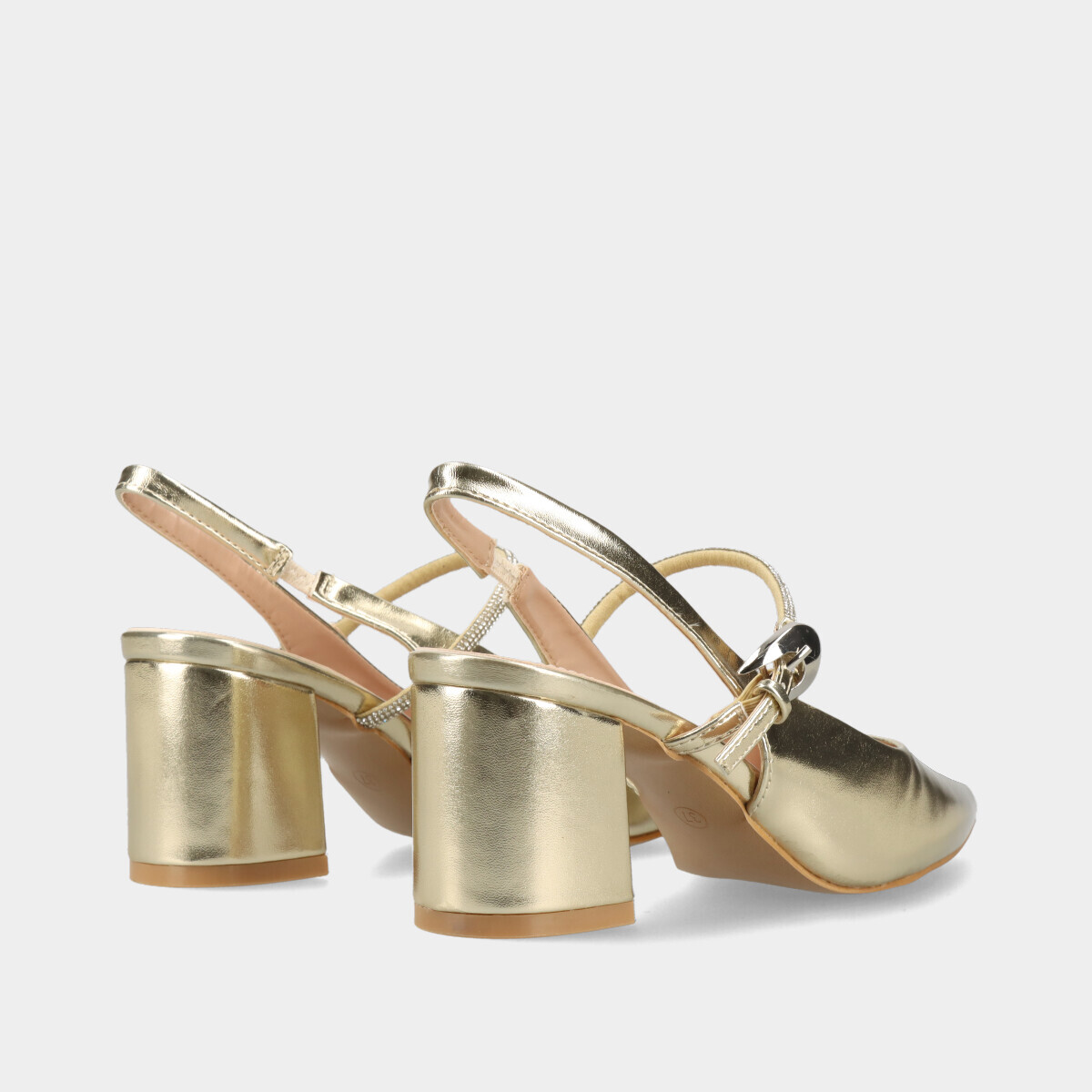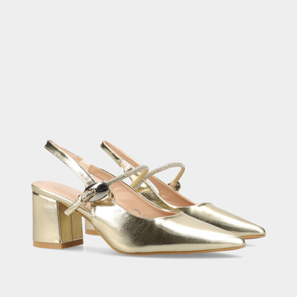 Mules de salto dourados com ponta em bico, tira traseira com elástico e tira de brilhantes sobre o peito do pé com fivela prateada ajustável.