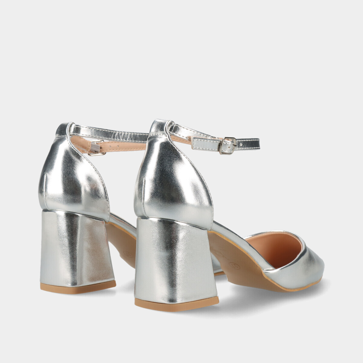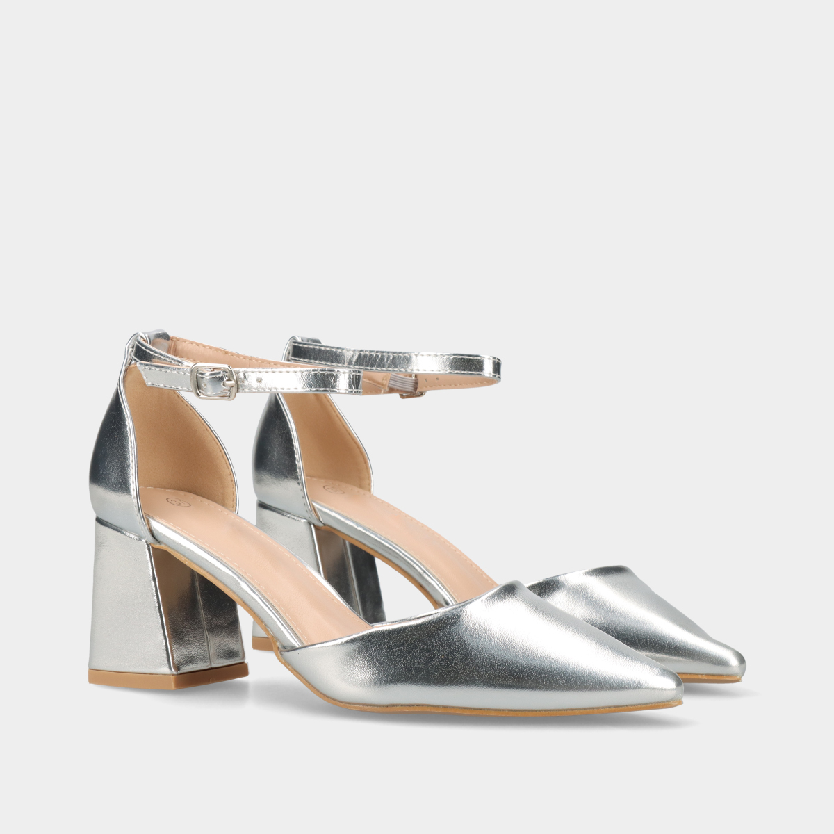 Sapatos de salto para mulher em prateado, com efeito metalizado, fivela lateral de ajuste fácil e salto quadrado estável. Sapatos elegantes e confortáveis, perfeitos para trabalho, cerimónias, festas ou uso diário, ideais para quem procura calçado feminino versátil e moderno.