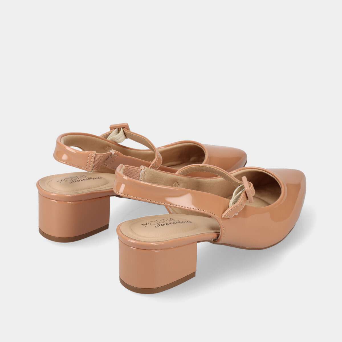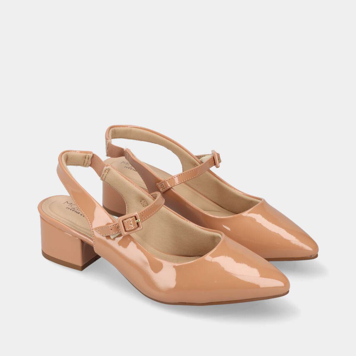 Sapato na cor bege com acabamento em verniz, ponta em bico, tira traseira com elástico e tira sobre o peito do pé com fivela ajustável.