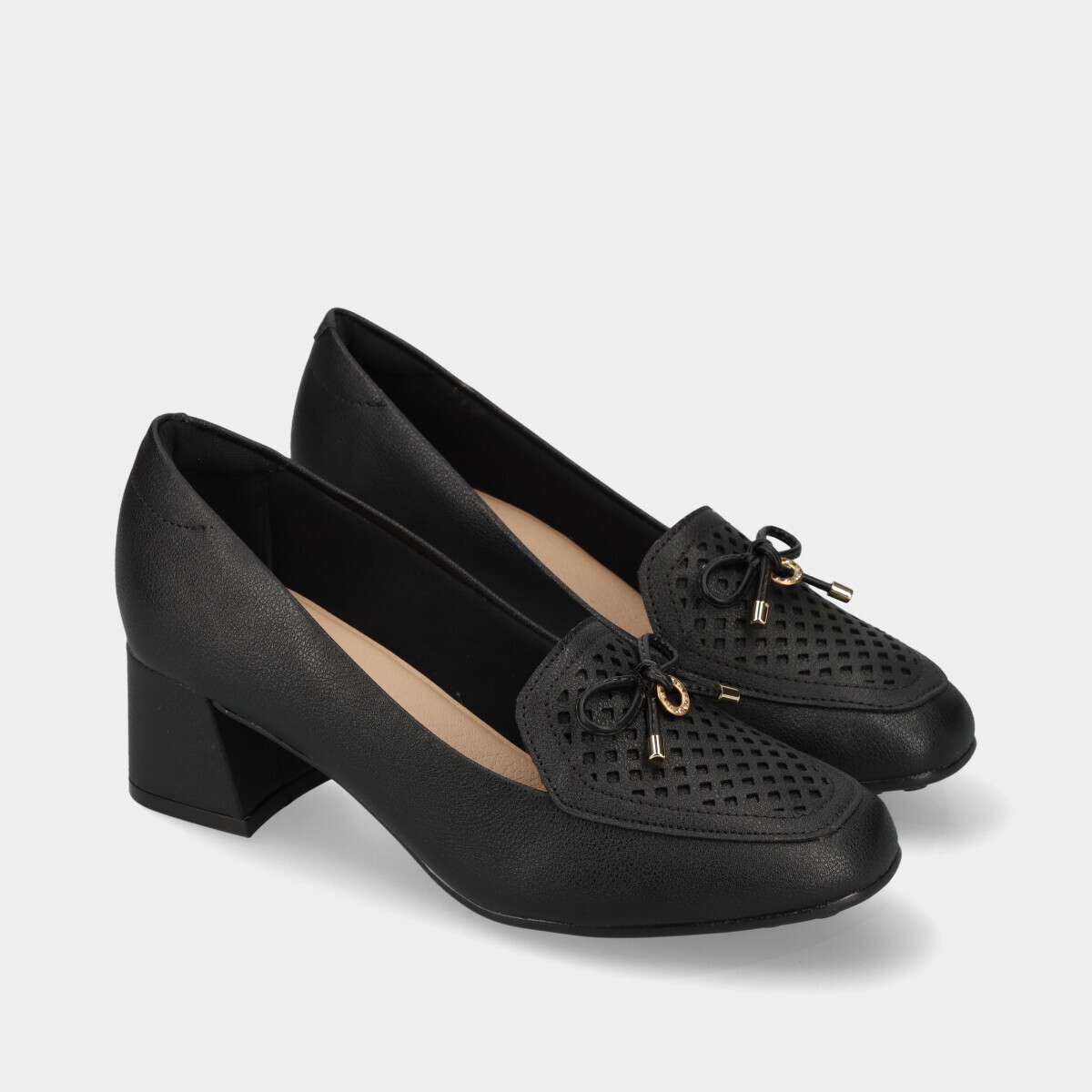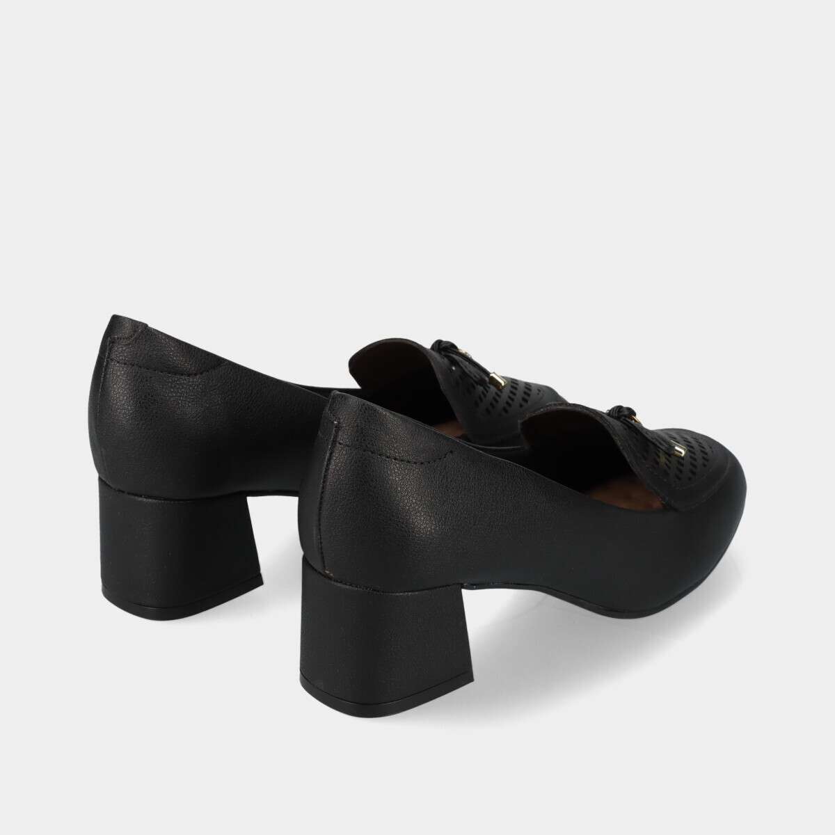 Sapato na cor preta, com ponta de acabamento texturizado e aplicação decorativa.