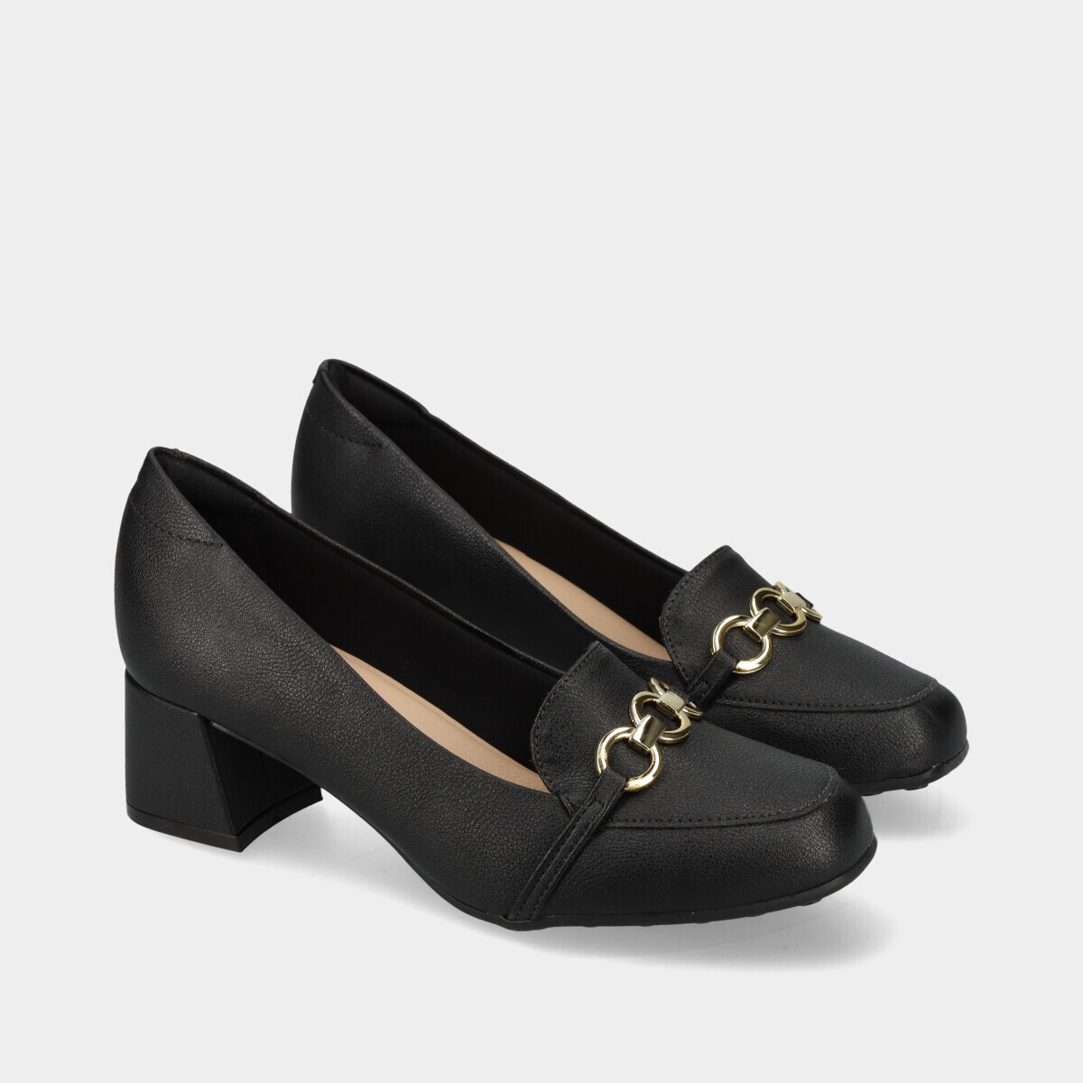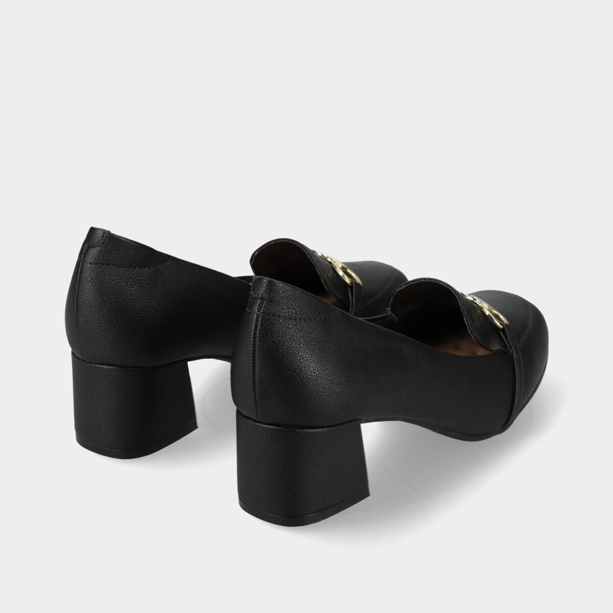 Mocassins de salto pretos de conforto para mulher, com biqueira quadrada, aplicação dourada e palmilha e rebordos acolchoados. Sapatos femininos elegantes para uso diário.