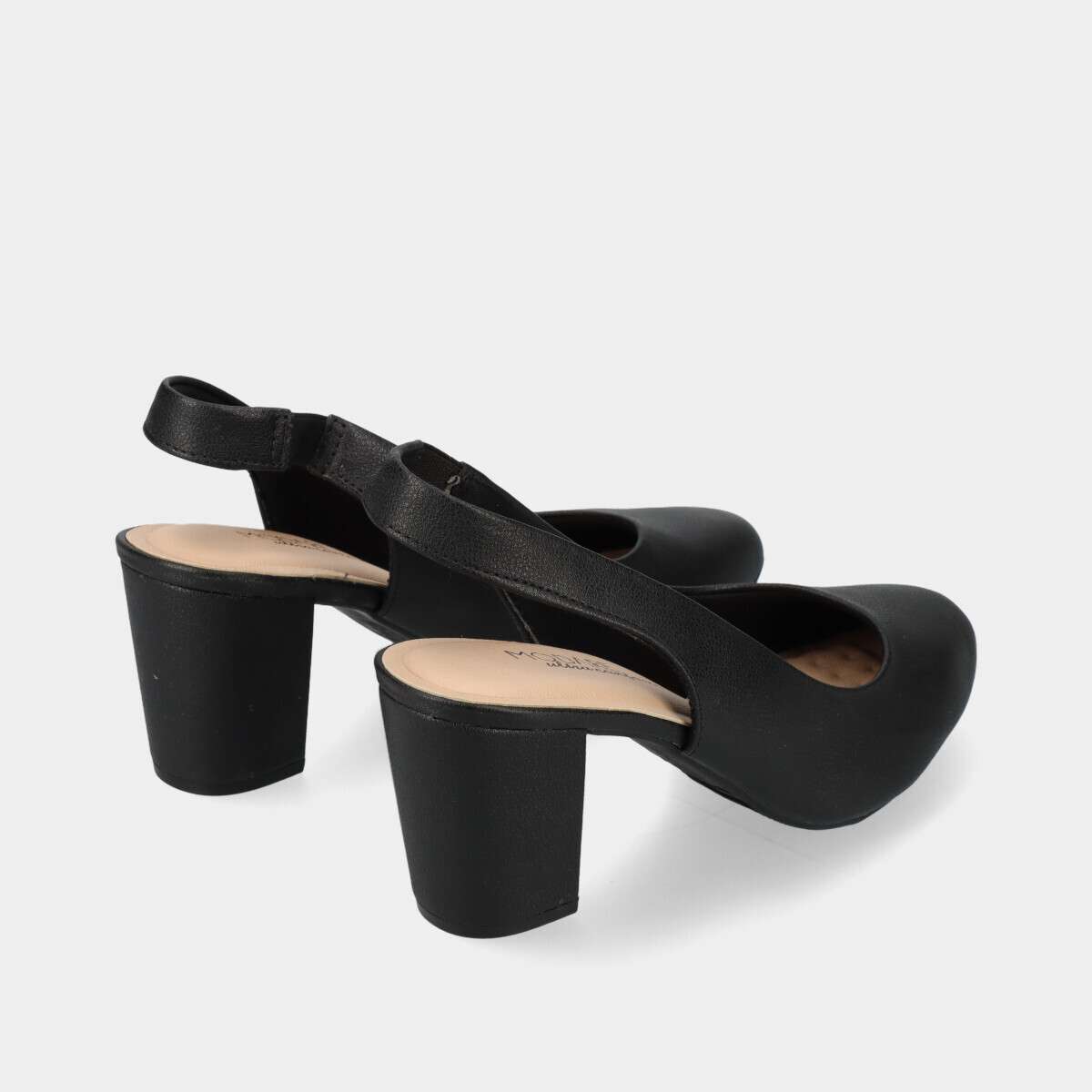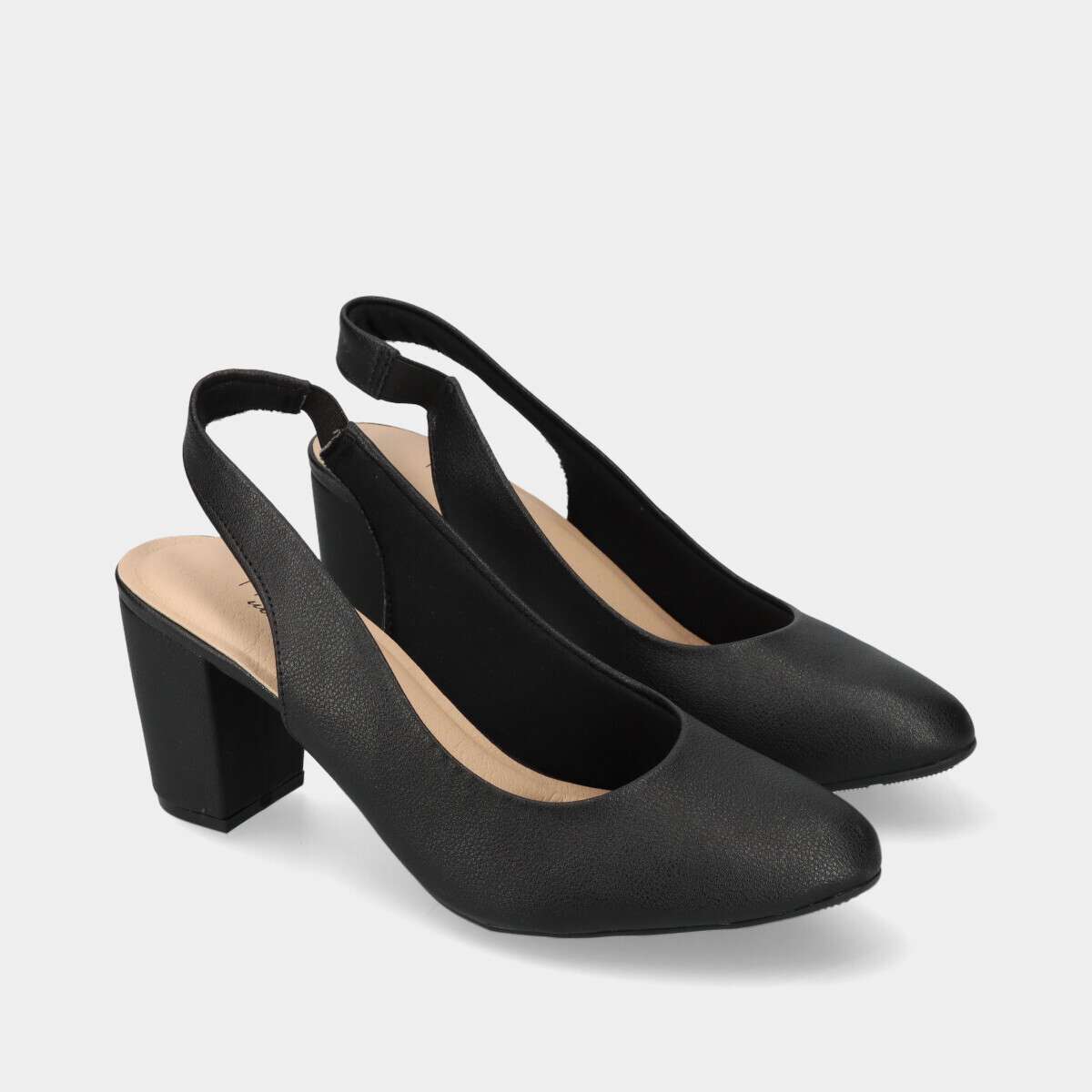 Sapato na cor preta com ponta arredondada e tira traseira com elástico.