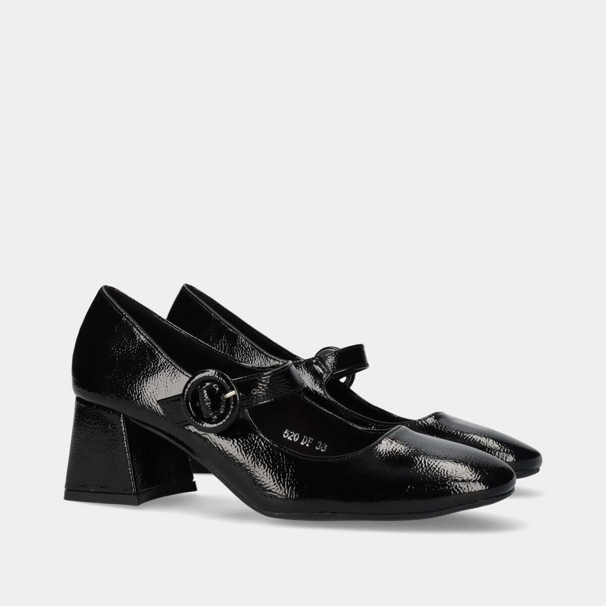 Sapato de salto quadrado na cor preta com uma fivela no peito do pé e palmilha de espuma.
