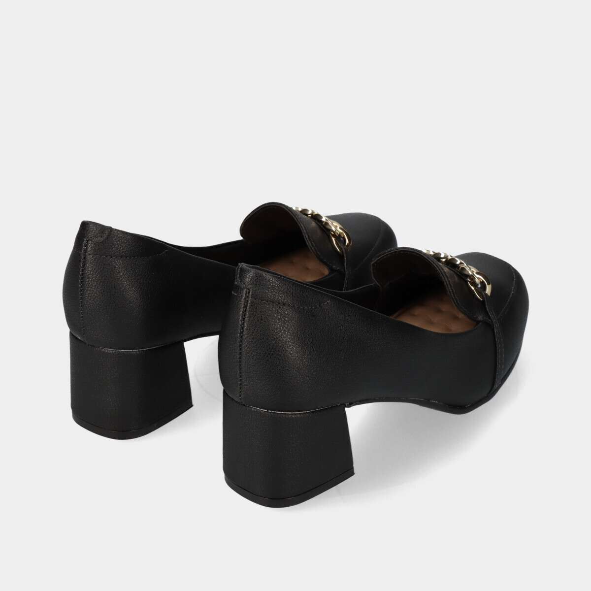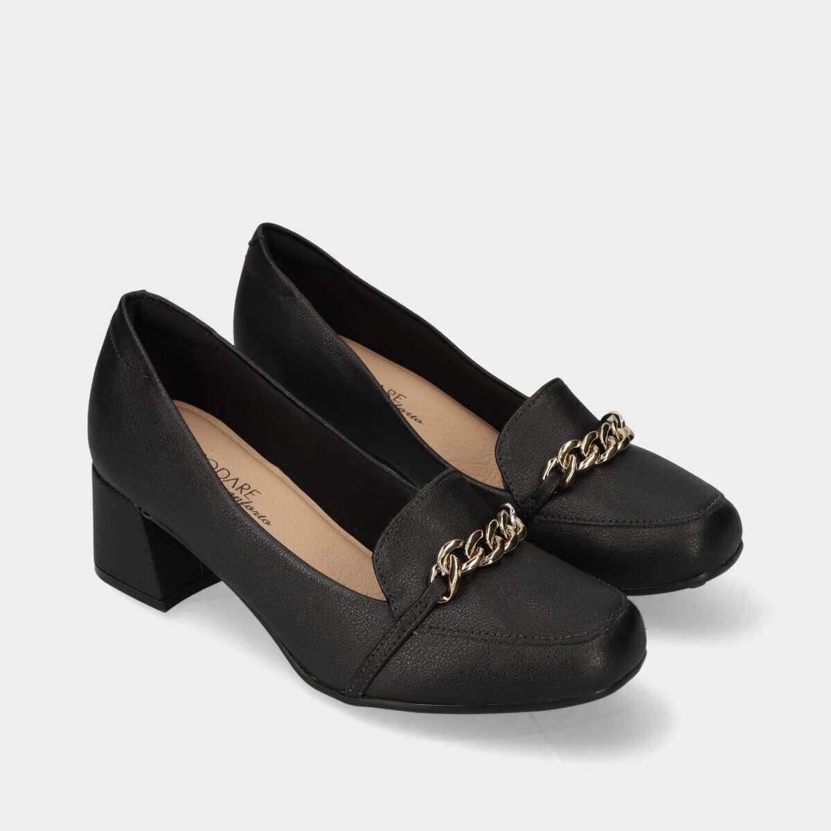 Sapato de salto na cor preta com corrente dourada no peito do pé e palmilha de espuma extremamente confortável.