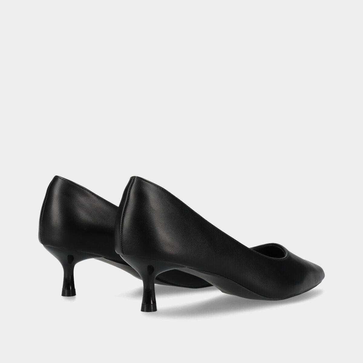 Sapatos de salto fino para mulher em preto com efeito pele, ponta em bico e palmilha acolchoada. Sapatos femininos elegantes, versáteis e ideais para trabalho, cerimónias ou uso diário.