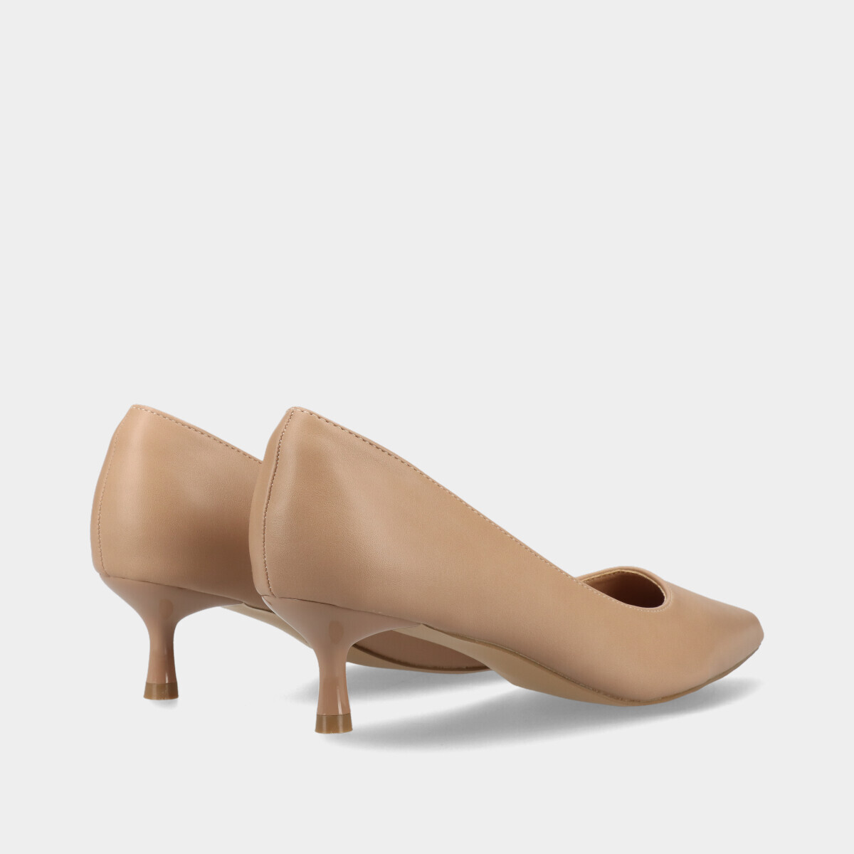 Sapatos de salto fino para mulher em bege com efeito pele, ponta em bico e palmilha acolchoada. Sapatos femininos elegantes, versáteis e ideais para trabalho, cerimónias ou uso diário.