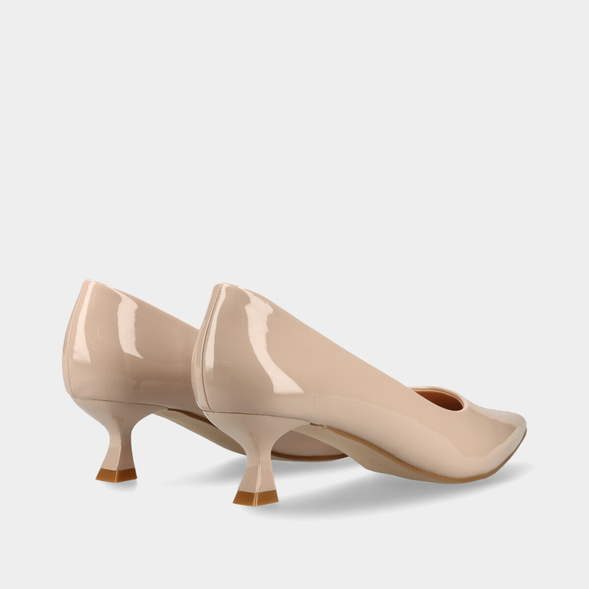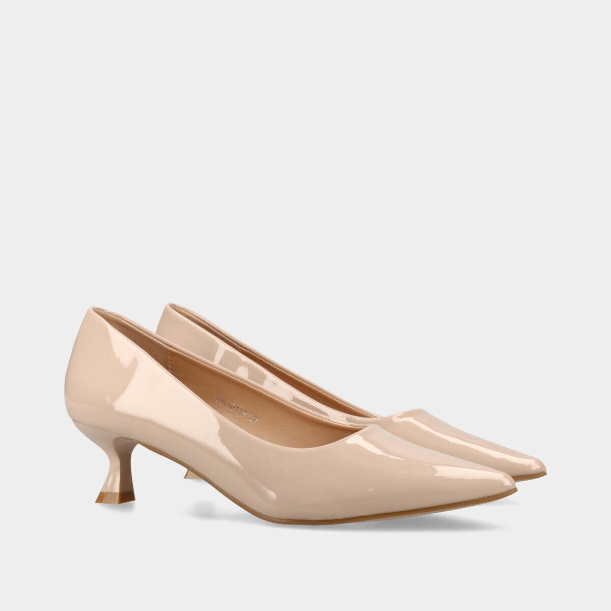 Sapatos de salto fino para mulher em nude com efeito verniz, ponta em bico e palmilha acolchoada. Sapatos femininos elegantes, versáteis e ideais para trabalho, cerimónias ou uso diário.