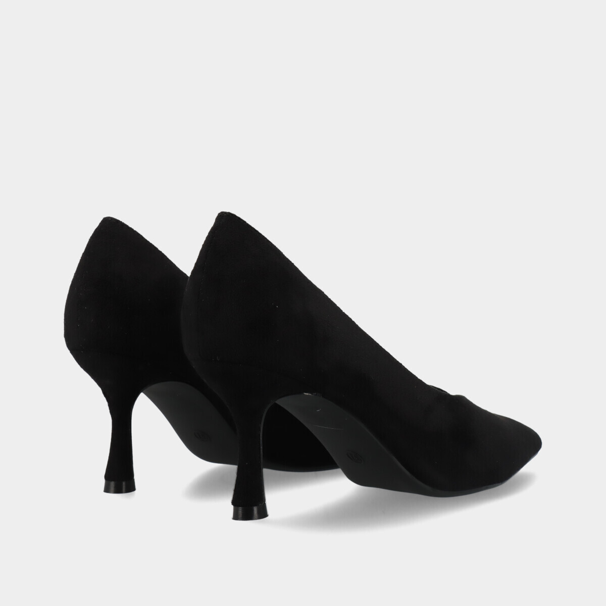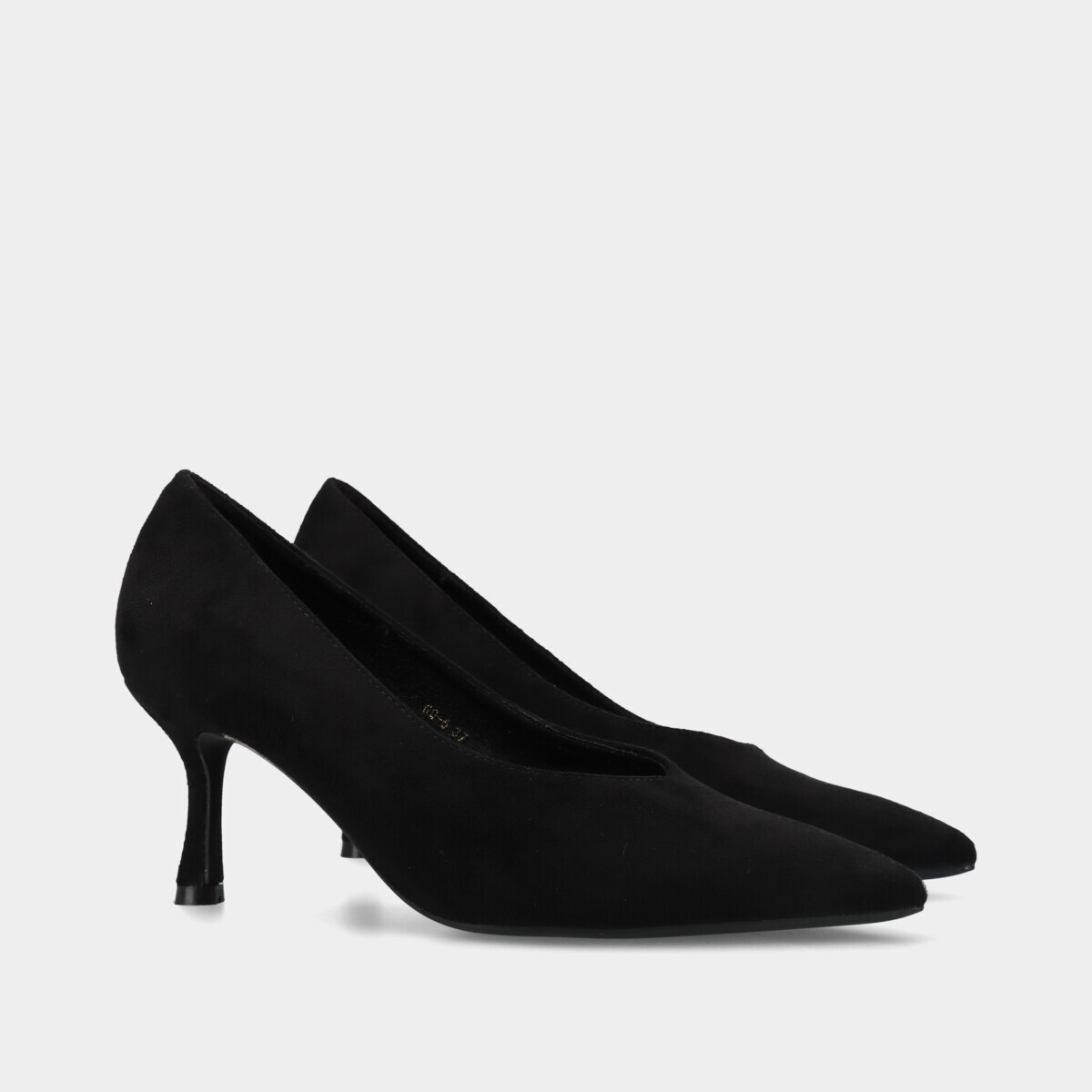 Sapatos de salto fino para mulher em preto com efeito camurça, ponta em bico e palmilha acolchoada. Sapatos femininos elegantes, versáteis e ideais para trabalho, cerimónias ou uso diário.
