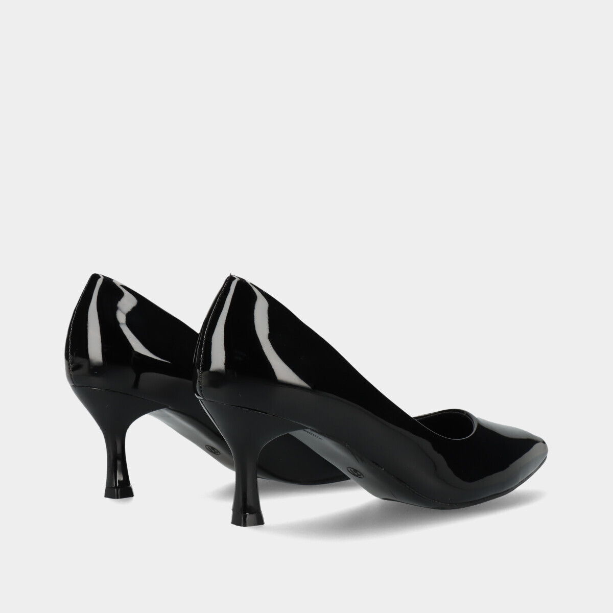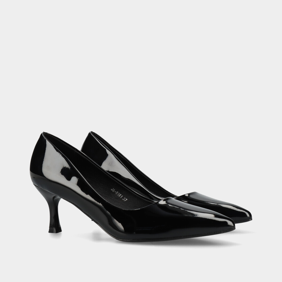 Sapatos de salto fino para mulher em preto com efeito verniz, ponta em bico e palmilha acolchoada. Sapatos femininos elegantes, versáteis e ideais para trabalho, cerimónias ou uso diário.