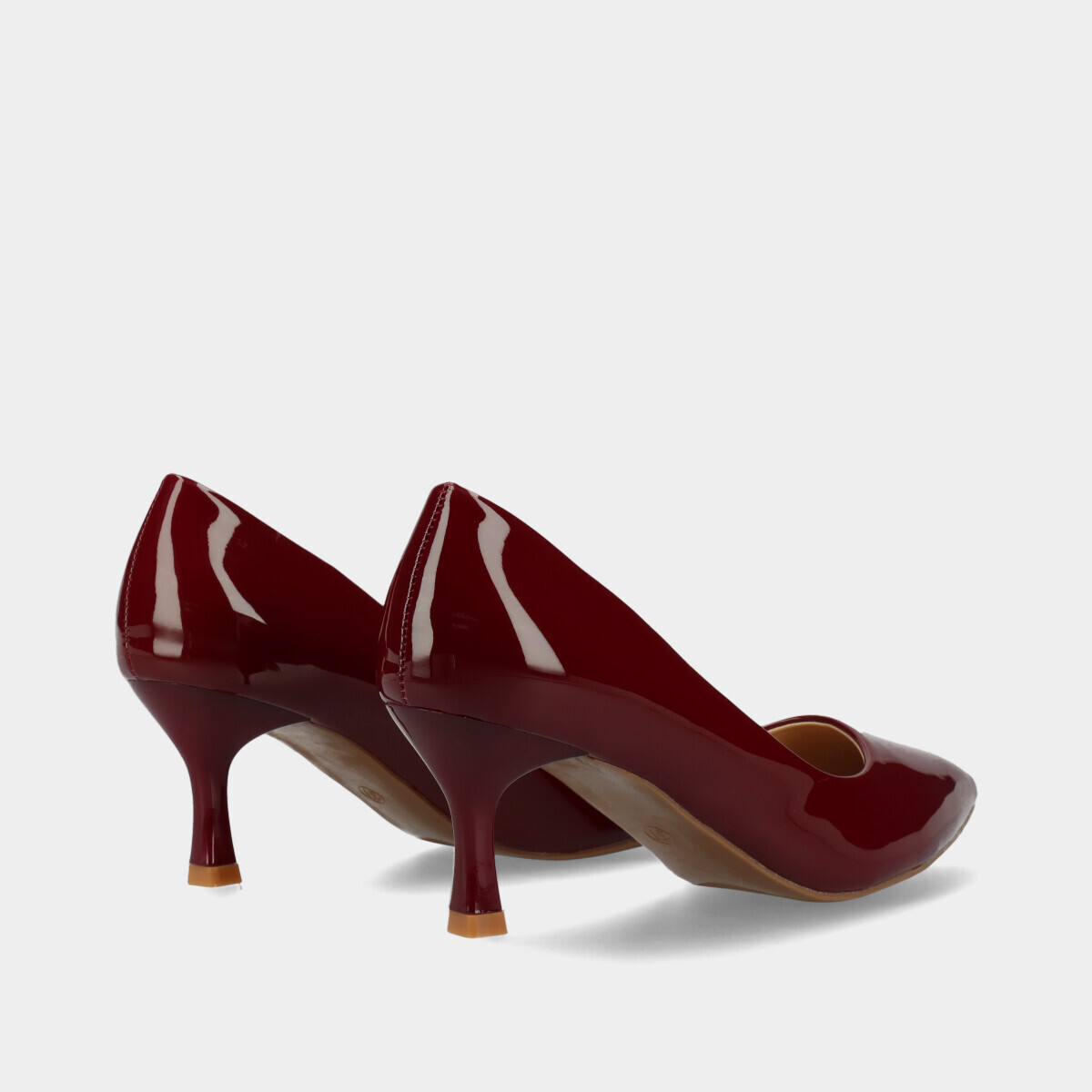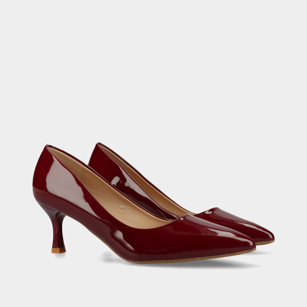 Sapatos de salto fino para mulher em bordô com efeito verniz, ponta em bico e palmilha acolchoada. Sapatos femininos elegantes, versáteis e ideais para trabalho, cerimónias ou uso diário.