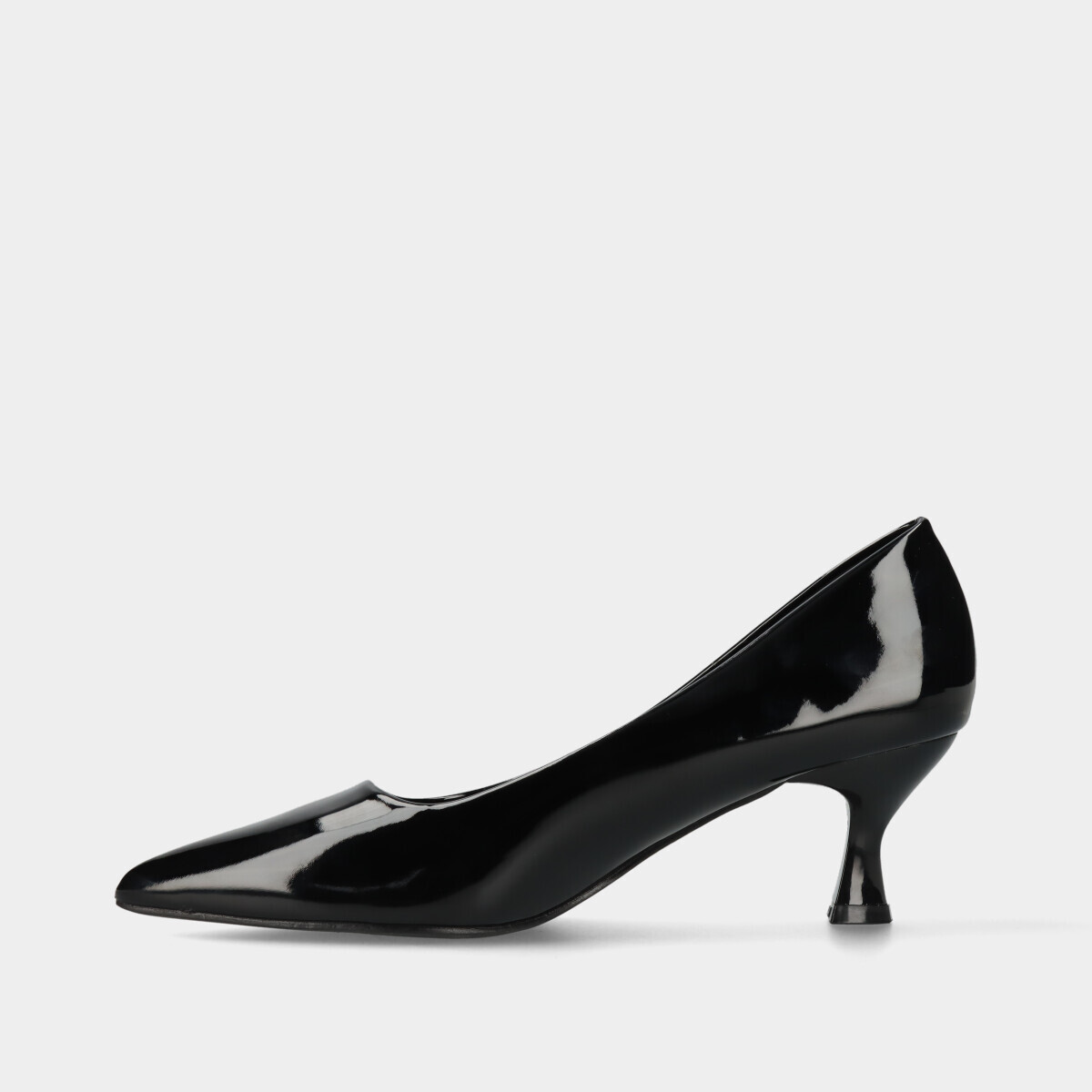 Sapato stiletto para mulher em preto verniz, com salto médio e palmilha confortável.