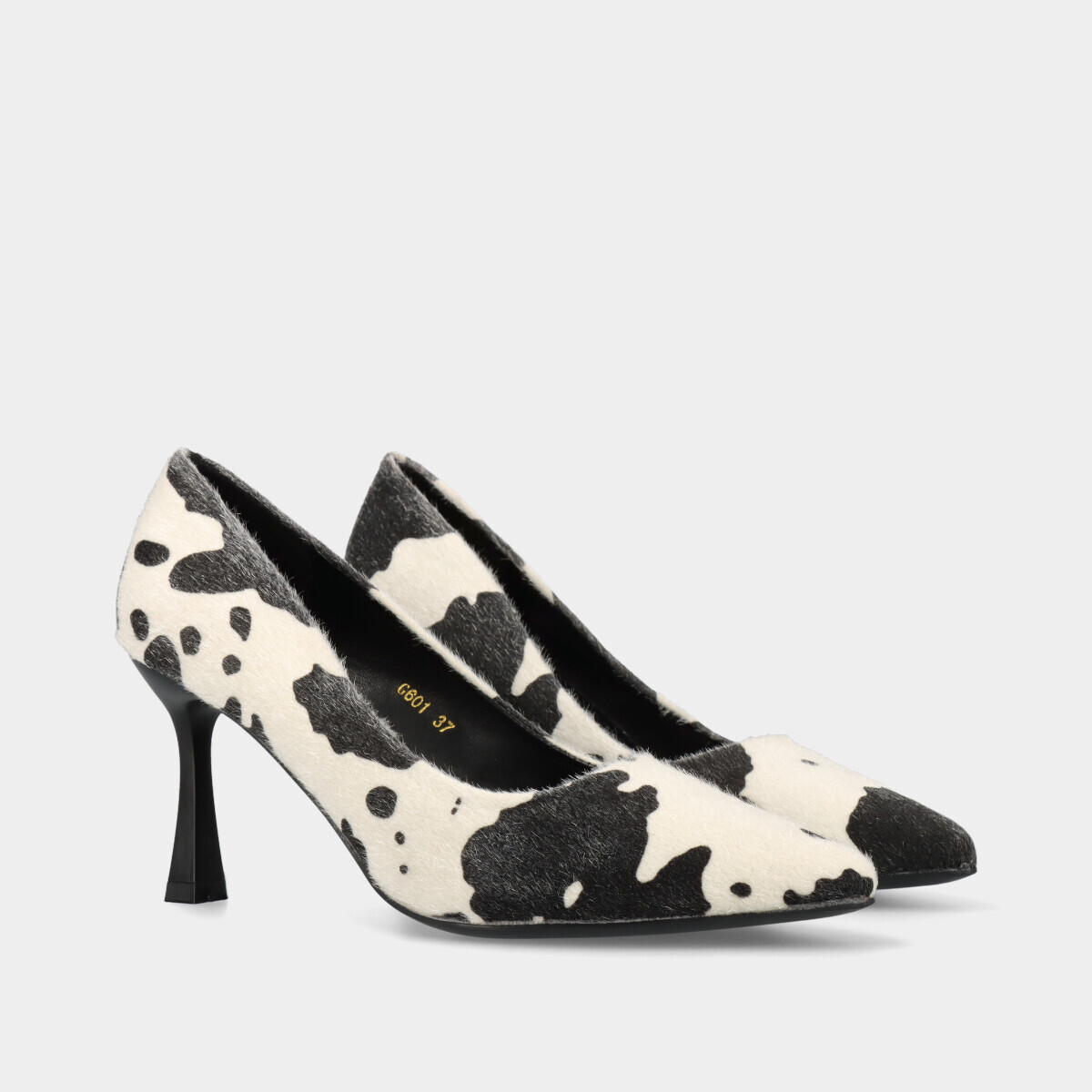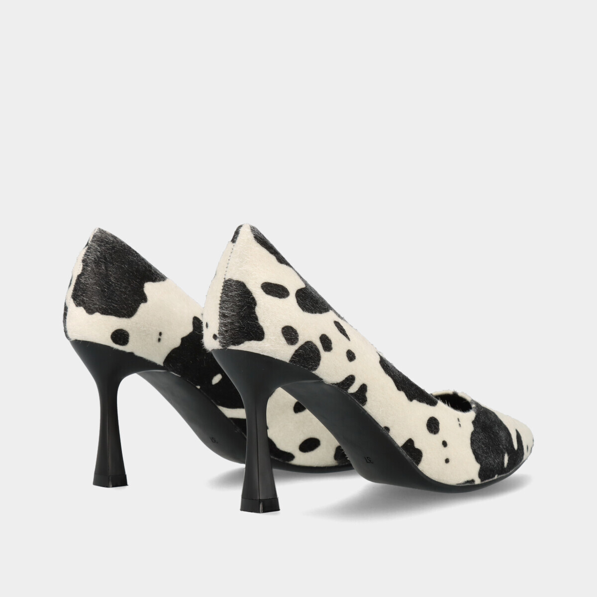 Sapato stiletto para mulher em preto e branco com padrão vaca, salto fino quadrado e palmilha confortável.