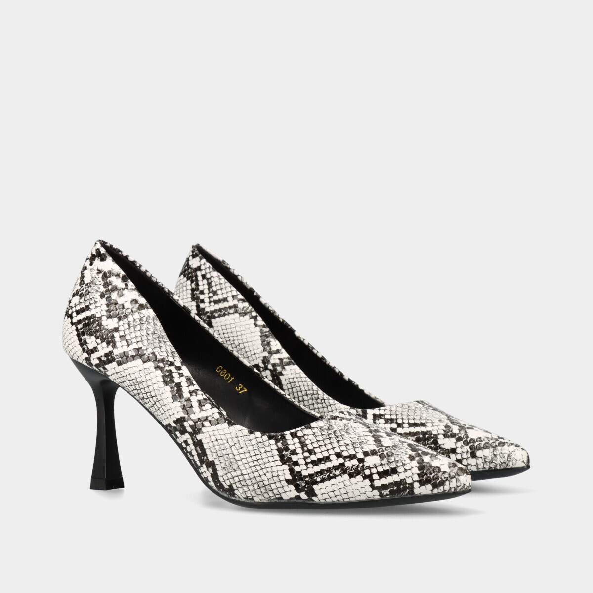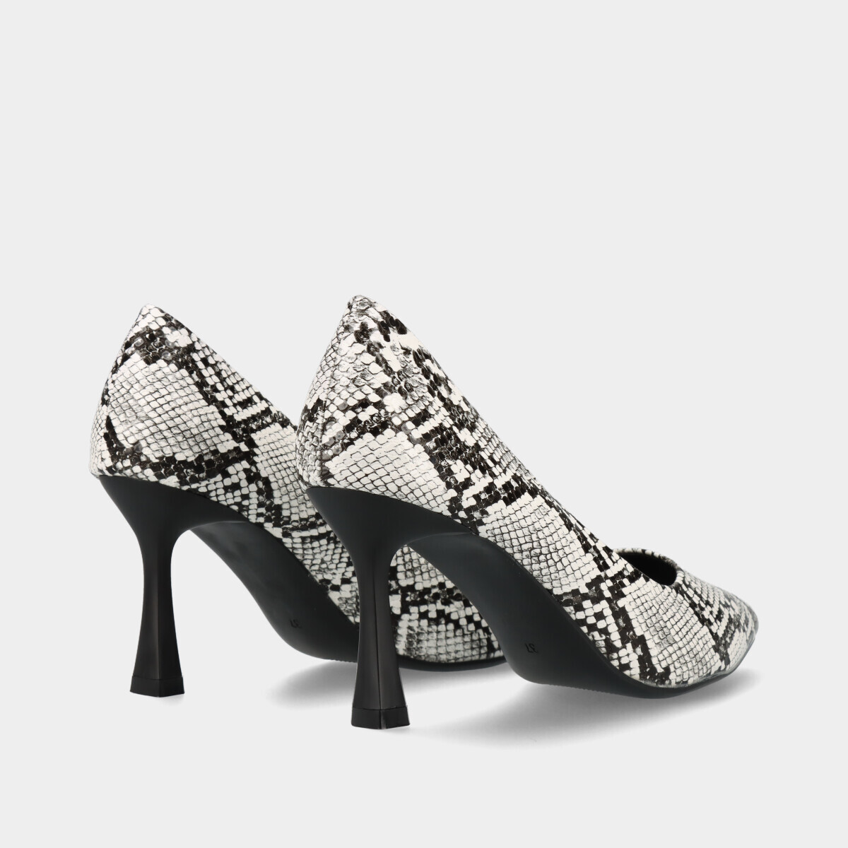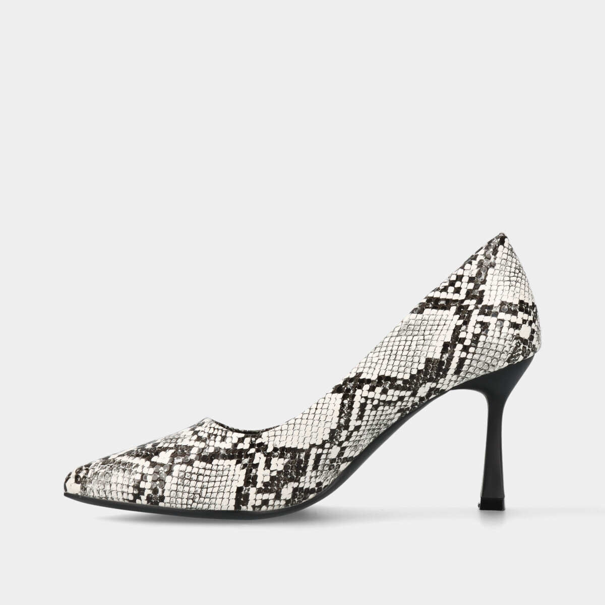 Sapato stiletto para mulher em preto e branco com padrão cobra, salto fino quadrado e palmilha confortável.