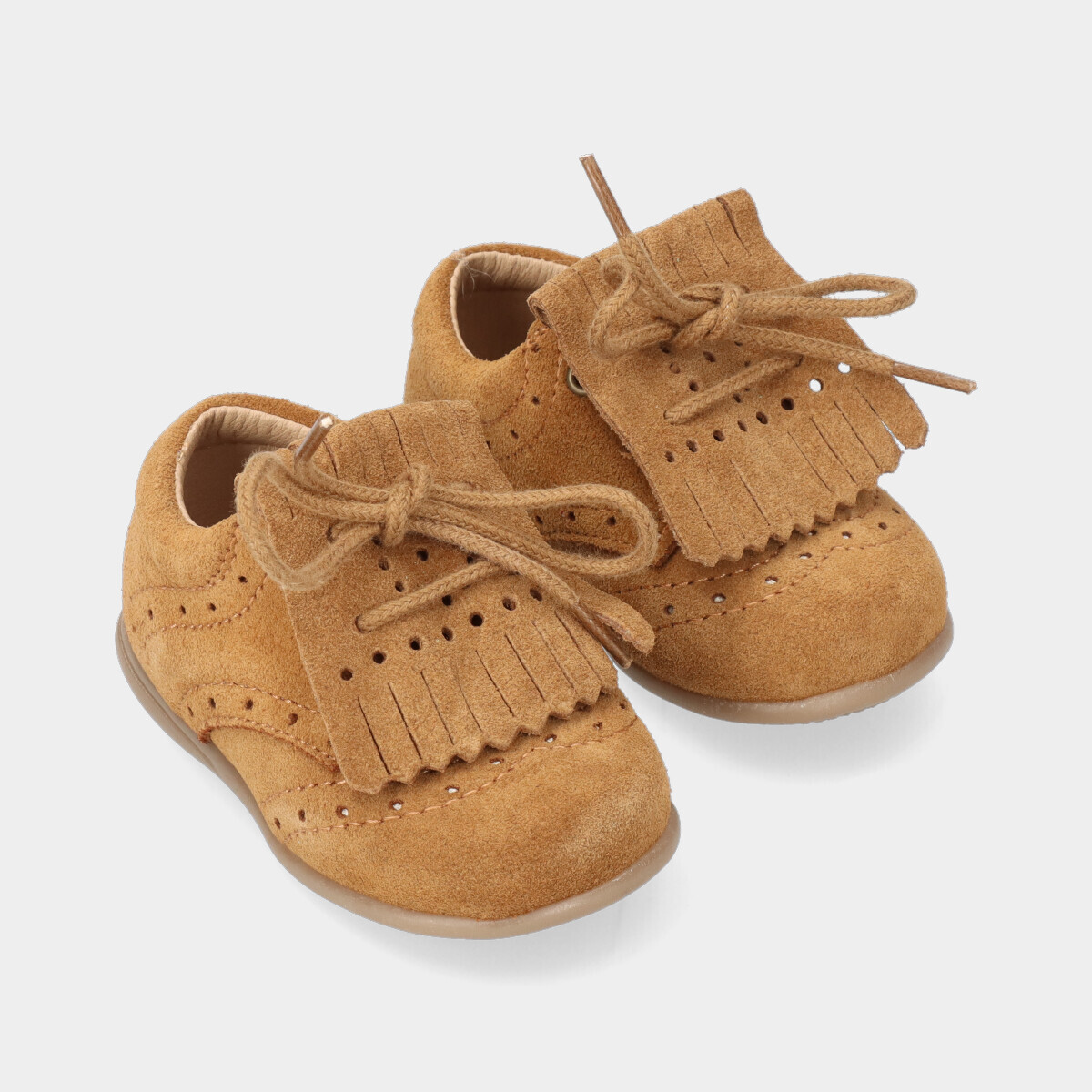 Sapato Carneiras para criança em camurça com pala de franjas removível, perfeito para ocasiões especiais.